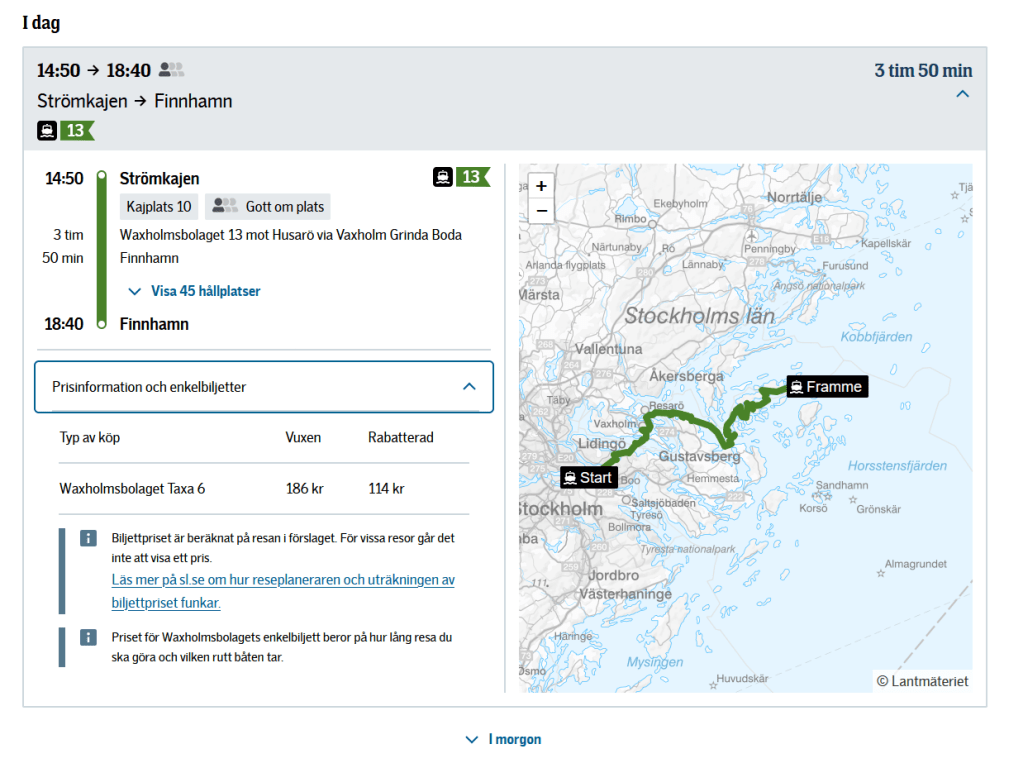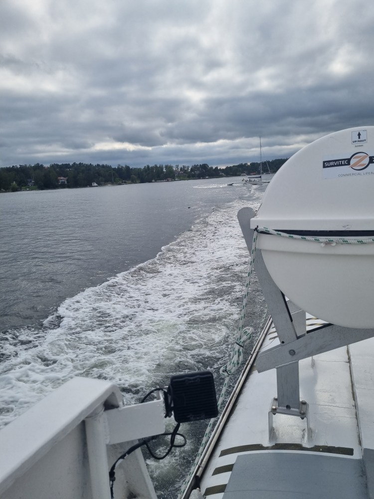 Entlang der Hauptschifffahrsrinne in Richtung Finnland gibt es zahlreiche Fährverbindungen des Unternehmens Waxholmsbolaget. Die aktuellen Fahrzeiten entnimmt man am besten Apps wie SL oder Res i STHLM. Tickets kauft man in der SL App nach Zone (Achtung: reguläre Tickets der Stockholmer Öffis gelten hier nicht), die erforderliche Zone lässt sich am besten auf der Website von Waxholmsbolaget abfragen.